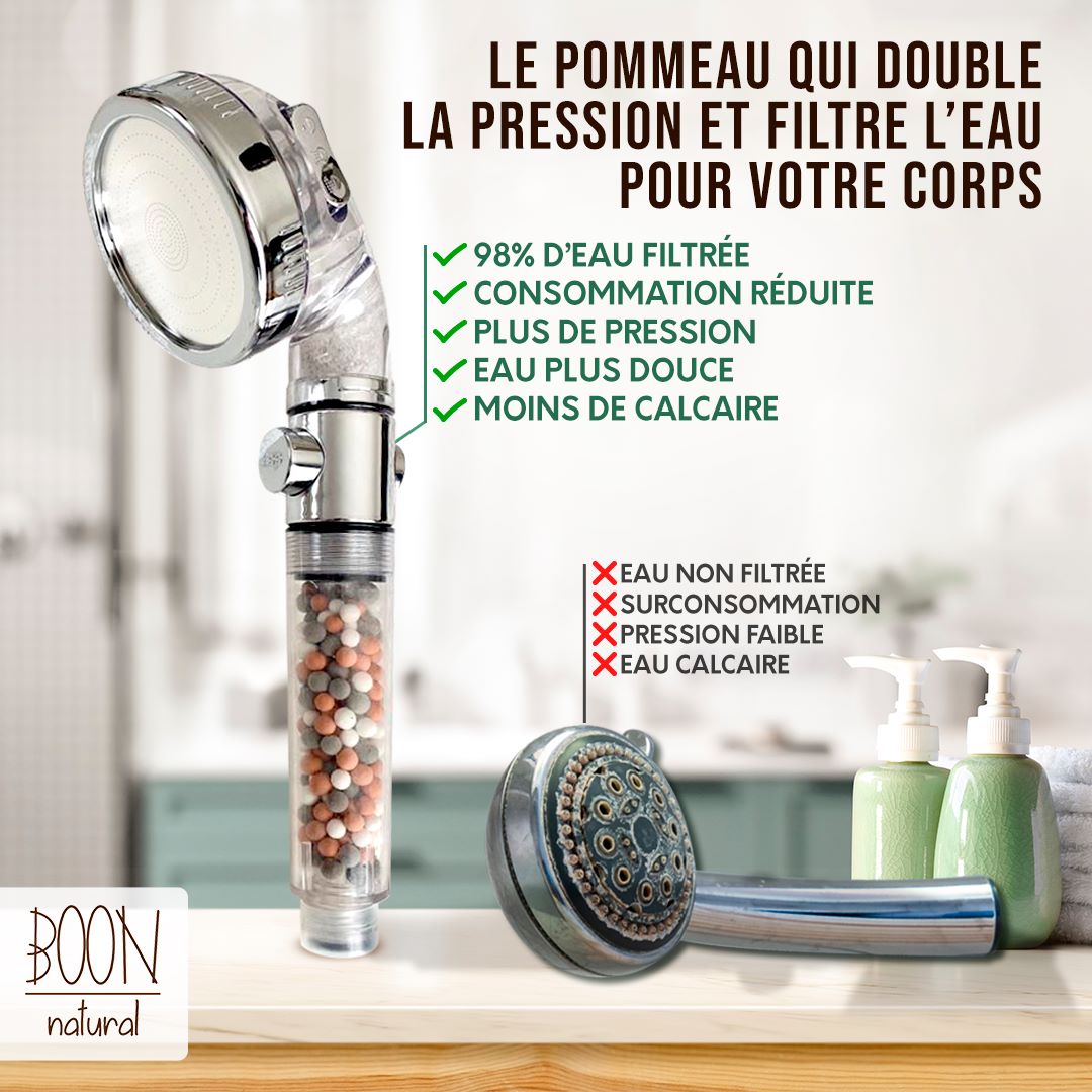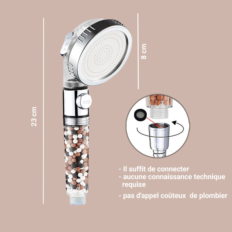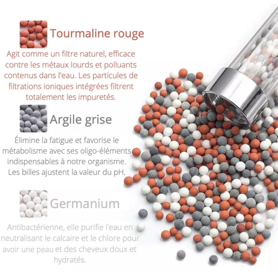 Grâce à ses 2 filtres intégrés et ses billes de pierres minérales absorbantes l'eau qui touchera votre peau sera beaucoup plus pure et douce. De ce fait, après votre douche votre peau sera beaucoup moins sèche car moins agréssée par l'eau calcaire.