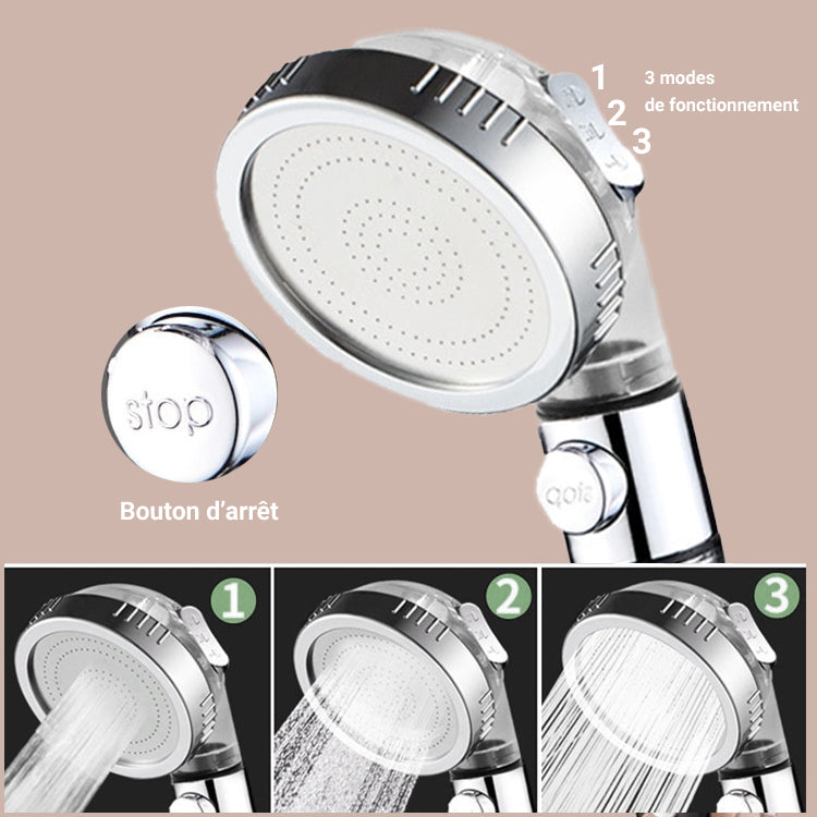 Avec notre pommeau de douche vous pouvez adapter vos envies avec ses 3 différents modes de pression : pluie fine, massant ou puissant. L'avantage c'est que vous gardez le contrôle sur la pression d'eau dont vous avez besoin. Profitez d'une douche relaxante et agréable comme si vous étiez au spa.