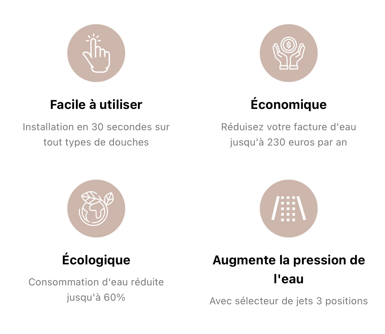 Grâce à notre pommeau de douche et son système de jet haute pression vous pouvez diminuer jusqu'a 60% votre consommation d'eau ! Soit une économie en moyenne de 200 euros par an de facture d'eau. Un très bon geste pour la planète et pour votre porte monnaie.