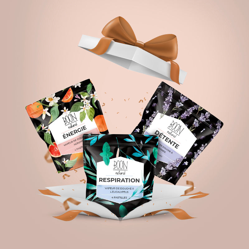Les pastilles Boon Natural, au-delà de transformer votre douche en un havre de paix, se présentent aussi comme le cadeau idéal pour vos proches. Car en fonction des besoins de chacun, 3 parfums et 3 bienfaits sont disponibles : Le parfum Agrumes, qui tonifie et apporte de l'énergie, l'Eucalyptus qui purifie l'air et désencombre les voix respiratoires. Et enfin, la Lavande, qui détend l'esprit et le corps, idéale pour se relaxer après une journée bien remplie. Les 3 parfums sont légers et faciles d'utilisation, Ils apportent une touche de bien-être unique à toute salle de bain.